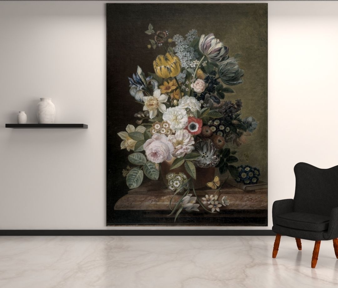 Stilleven met bloemen op een stenen plint. Boeket met rozen, tulpen, narcissen, irissen, duizendschoon en koekoeksbloemen. Tussen de bloemen ook enkele vlinders, rechts een boek. Kortom een mooi schilderij voor aan de muur. Deze wanddecoratie is zeer geschikt voor in jullie woonkamer en is in elk gewenst formaat bestelbaar.